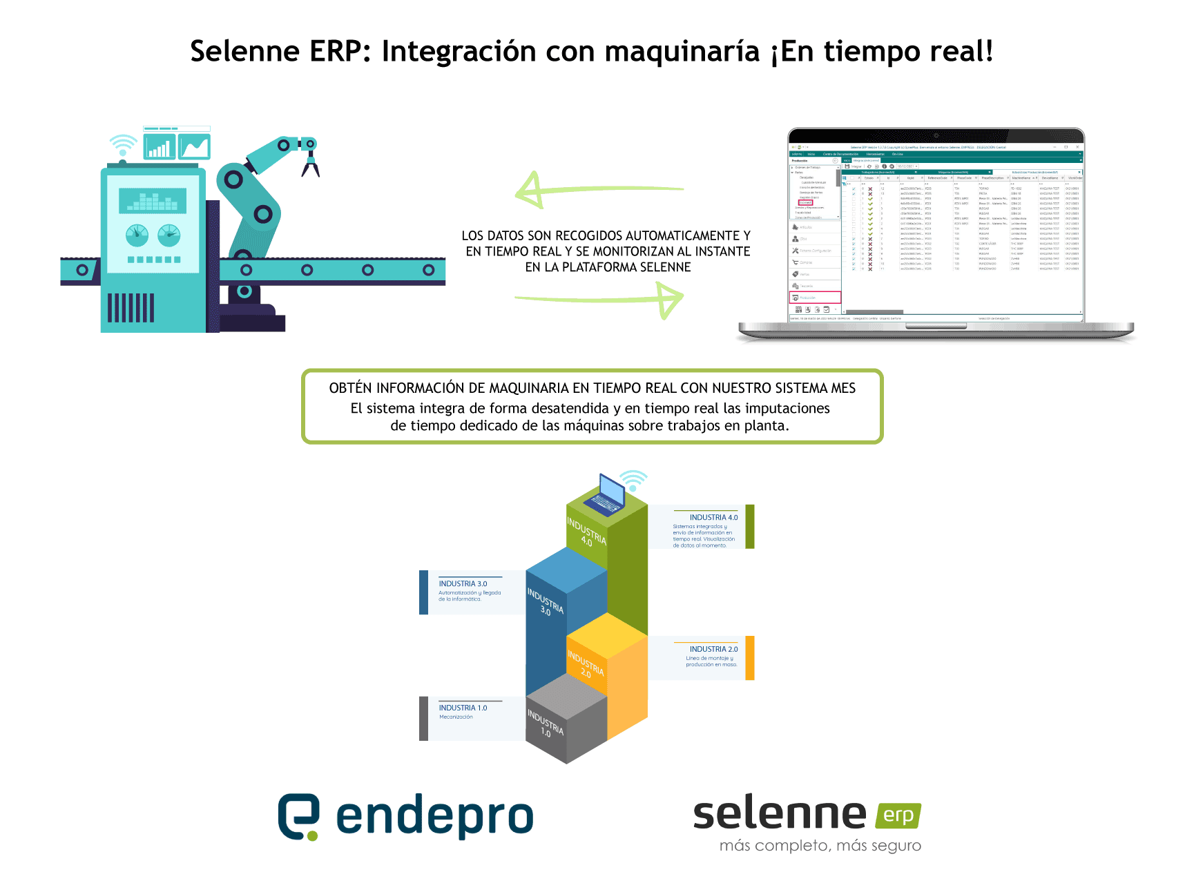 El sistema Mes de Selenne ERP integra, de forma desatendida y en tiempo real, las imputaciones de tiempo dedicado de las máquinas sobre los trabajos en planta.